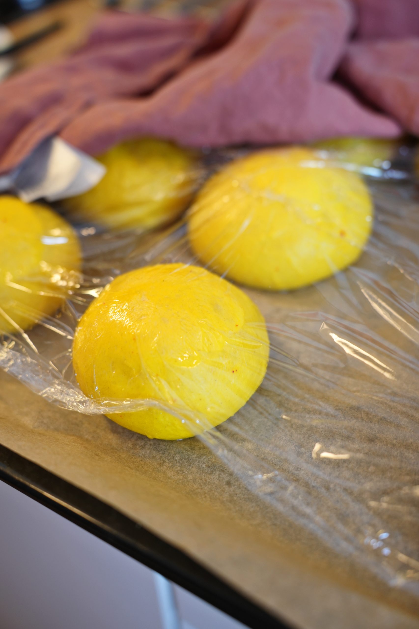 - Mjöla bordet lite lätt och tippa ner degen. Dela upp degen så att varje munk väger runt 65 gram. Forma handen till ett C och snurra degen så att det formas till en fin boll. Detta kallas för rundrivning. Lägg munkarna på ett bakplåtspapper, pensla de lite lätt med olja, platta till munken försiktigt med handen, täck med plastfolie och en duk. Låt den jäsa ytterligare 1 timme, eller tills munken dubblat i storlek (mina blir cirka 9 cm stora).